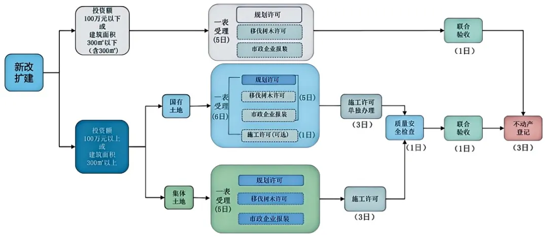 近年来,北京市持续深化工程建设项目审批制度改革,一是探索建立基于风险的分级分类审批制度,按照无风险项目“非禁免批”,低风险项目“简化审批”,一般风险项目“告知承诺”,高风险项目“严格审批”的4类方式推进改革,特别是在全国率先推出简易低风险改革,项目办理时限由208天压缩至14天。二是强化部门协同、推行“并联审批”,有关主管部门合力再造审批流程,推行“多规合一”“多审合一”“多测合一”“多验合一”叠加施效的高效审批模式。据公开数据,北京市建筑许可相关的14个审批部门的200余项审批服务事项已压减一半以上。