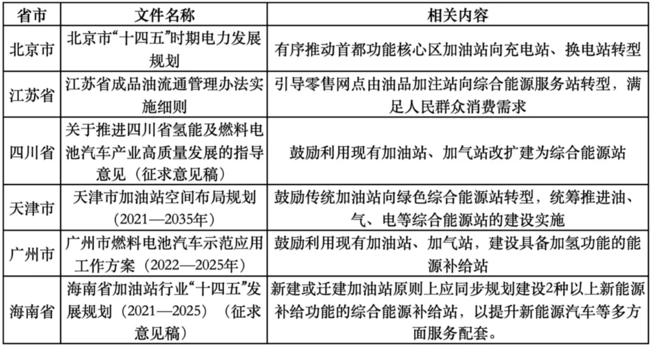 新能源汽车成为交通领域落实“双碳”战略和保障国家能源安全的重要抓手,国家发展改革委、国家能源局《关于完善能源绿色低碳转型体制机制和政策措施的意见》《关于加快推进充电基础设施建设 更好支持新能源汽车下乡和乡村振兴的实施意见》等文件及北京、江苏、四川、天津、广州等地,均鼓励传统加油站、加气站建设综合能源站。同时,北京市发布《北京市加油站设置新能源设施安全生产管理工作指引》,率先明确加油站设置充换电设施的安全技术要求。