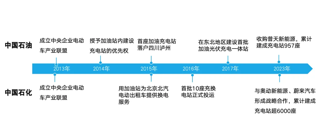 2014年,中国石油授予中国资源交通集团在广东、河南近2000座加油站内建设充电站优先权;2015年,油电综合能源站落户四川泸州,可同时为30辆电动汽车提供充电服务;2017年,与普天新能源、大连普达新能源启动合作,在东北地区建设首批加油光伏充电一体站。2015年,中国石化与北汽新能源携手,在北京试运行了第一座充电站,并着手利用加油站为北汽电动出租车提供换电服务;2016年,首批10座充换电站正式投入使用。