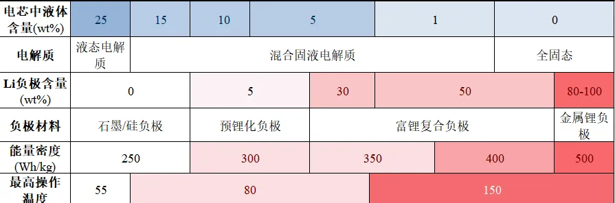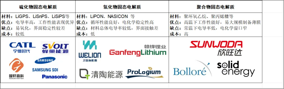 “固态电池”一般分为半固态和全固态,对应的液体含量分别是5-10wt%、0wt%。固态电池研究主要以硫化物电解质技术和氧化物电解质技术路线为主,辅以聚合物电解质技术路线,其中宁德时代、蜂巢能源、国轩高科为硫化物电解质技术路线的代表企业,卫蓝新能源、清陶能源、辉能科技为氧化物电解质技术路线的代表企业,欣旺达为聚合物电解质技术路线的代表企业。