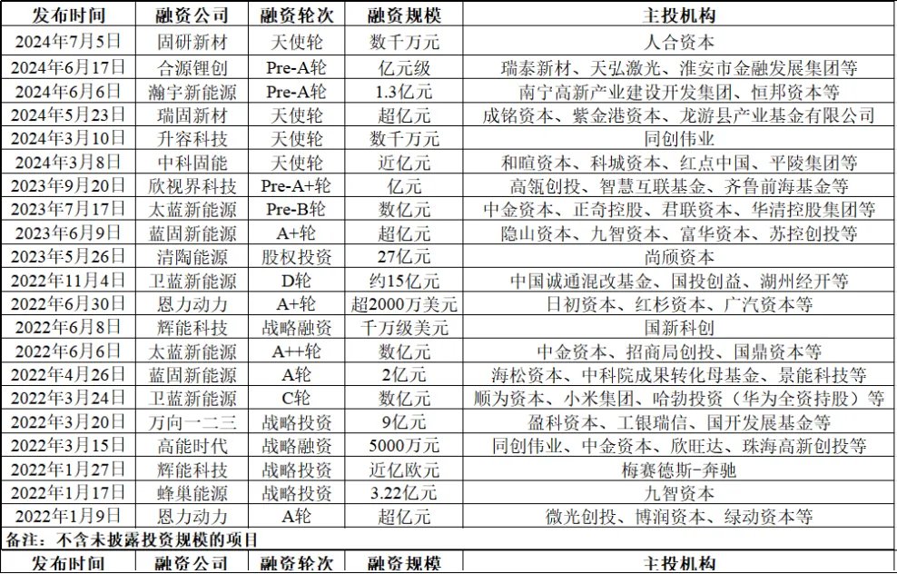 表1 2022-2024年中国固态电池行业部分投融资事件