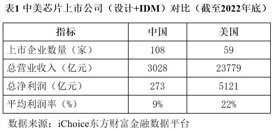 二是低端化竞争严重。如表1所示,根据2023年上半年已经上市的108家设计企业的半年报数据,108家企业中亏损的企业数量高达42家,2022年设计领域全部上市企业的总营收和总净利润分别是美国上市芯片企业(设计+IDM企业)的12.7%和5.3%,平均利润率相差近3倍。低利润率的原因在于大量设计企业在产品端缺乏差异化创新,只能进行价格战,同时企业数量短时间内大量扩张引发人才和供应链资源的激烈“争夺”,造成成本的快速上涨。