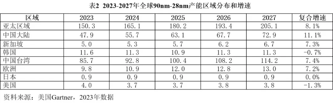 一是我国集成电路成熟工艺扩产速度和扩产主体数量全球第一。根据美国市场机构Gartner的数据,2023-2027年韩国、日本和美国三国12寸成熟工艺代工产能年均复合增长率均为负值或零增长,几乎放弃了在成熟工艺产能上的投入,而中国大陆则是增长最快(年均复合增长率超过8%)的区域,同时也是扩产主体最多(超过25家)的区域。