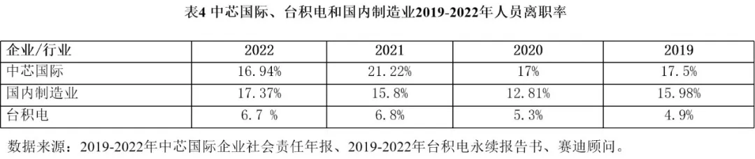 一是人才资源内耗严重。产业“内卷化”势必会带来严重的人才内耗,尤其是对于制造业、设备材料业这些本就人才总量严重不足,高端人才捉襟见肘的领域伤害更大。近年来国内的“建厂潮”,导致制造业人员离职率居高不下,如表5所示,近4年制造业人员离职率持续在15%以上,是台积电人才流失率的2-3倍。而国内制造业龙头中芯国际在2020年、2021年两个“建厂”大年,人员离职率相比国内制造业平均水平高出5个百分点。