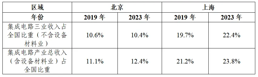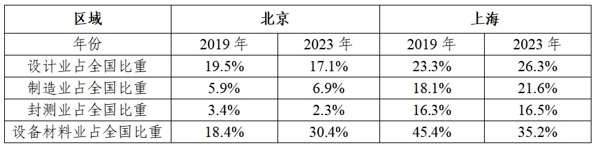 表3 2019年和2023年北京、上海的集成电路产业各环节占全国比重的对比(亿元)
