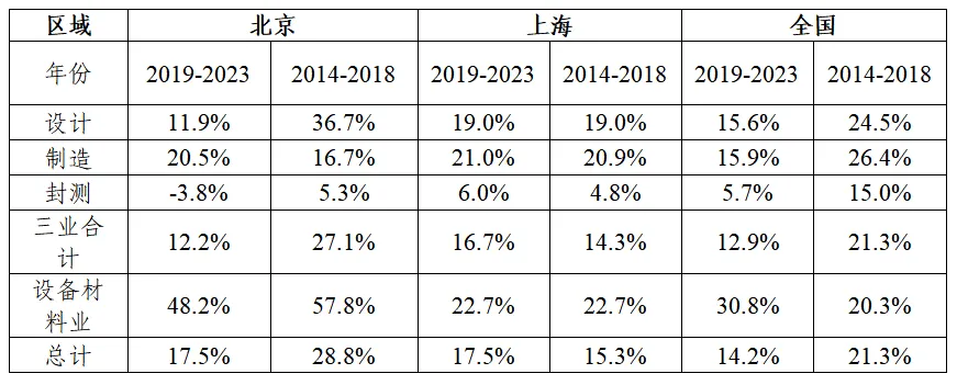 表2 2014-2018年和2019-2023年两个五年全国、北京、上海的集成电路产业规模增速对比