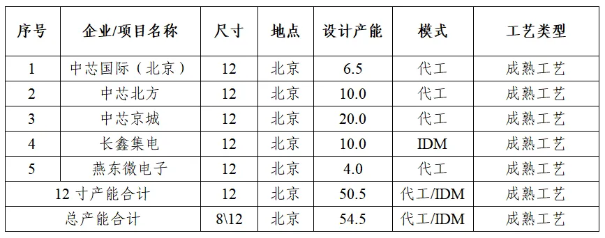 表6 北京集成电路12寸产能和总产能情况(万片)