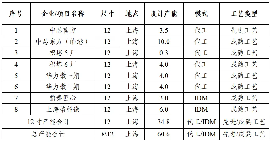 表7 上海集成电路12寸产能和总产能情况(万片)