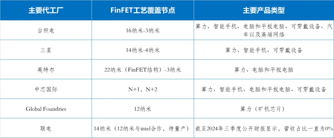 表1 全球主要代工厂FinFET工艺覆盖节点和主要产品