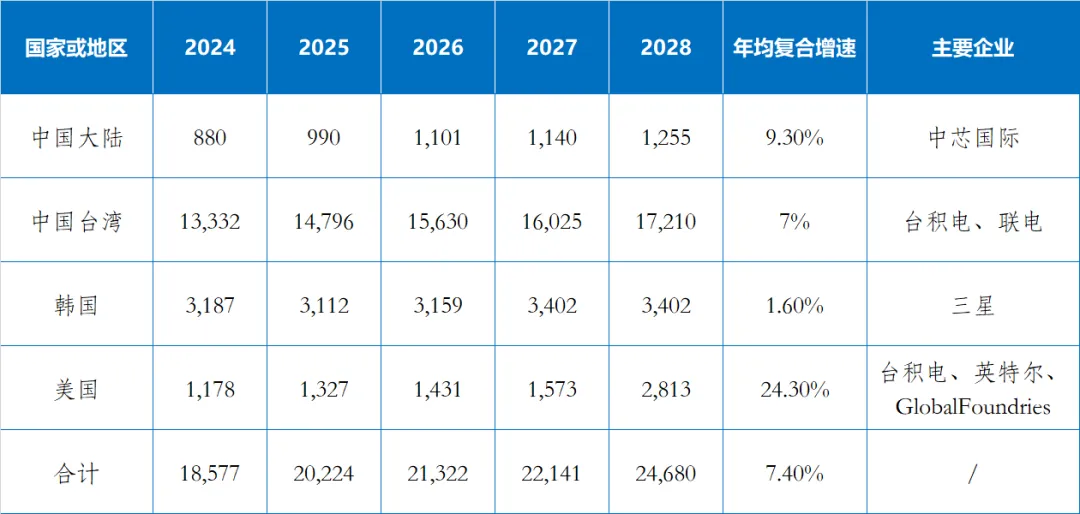 表2 2025-2028年全球FinFET工艺分布及所在区域的主要企业(等效8英寸晶圆月产能/千片)