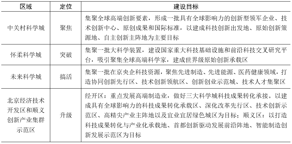当前我国面临错综复杂的国际形势,国际科技创新合作面临巨大挑战。“三城一区”作为国际科技交流与合作的承载地、国际科技创新中心建设的主平台,科技创新资源高度集聚,政策叠加优势尤为突出,加快推动“三城一区”统筹联动和融合发展,促进各区优势互补,强化创新链、产业链和供应链协同共生,对北京建设科技创新之城、争先竞逐世界高地意义重大。本文将从“三城一区”融合联动发展现状入手,剖析融合联动发展存在的问题,并研提对策建议,以期为推动“三城一区”融合联动向纵深发展提供支撑。 一、“三城一区”融合联动成效初显,问题仍存 目前,“三城一区”融合联动发展取得初步成效,协调对接机制初步形成、联动发展分工定位逐步明确、社会组织驱动联动合作日益增多,但仍然存在顶层设计亟需优化、协调力度有待提升、优势互补尚未达成、协同创新合作不足等诸多问题。 (一)组织架构搭建完成,运行机制尚待优化 为支撑北京国际科技创新中心建设,北京市设立“一处七办”[1]组织架构,北京推进科技创新中心建设办公室秘书处(以下简称“北京办公室秘书处”)负责北京办公室日常工作,7个专项办各司其职,负责具体推进各专项工作,覆盖重大科技战略落实、政策创新改革、科技人才建设等重点领域,涵盖“三城一区”科技创新主平台。但由于“一处七办”缺乏实体领导机构,专项办主要依托相关市属委办局、各区政府工作体系运转,凝聚力有待加强。 (二)协调机制初步建立,协调力度有待提升 北京办公室秘书处牵头建立了协调会议机制,包括周例会、季度调度会及半年度调度会等形式,为“三城一区”搭建了沟通交流平台。“三大科学城”与“一区”签订战略合作协议,各单位相应建立工作专班或领导小组,初步探索建立了联动发展机制。但“三城一区”尚无市级层面领导机构,联动层级不够,工作协调力度不足,不能有效地解决“三城一区”融合联动发展中出现的深层次问题。 (三)联动分工初步明确,优势互补尚未达成 北京市根据“三城一区”创新资源、产业特点、发展方向等方面,明确了“三城一区”具体发展定位及建设目标(见表1),但“三城一区”融合水平尚需提升,目前并未在联动基础上充分发挥“三城一区”各自的优势力量,创新链、产业链难以形成有效衔接,创新资源优势尚未充分转化为产业优势。 表1 北京市“三城一区”各区域规划发展定位
