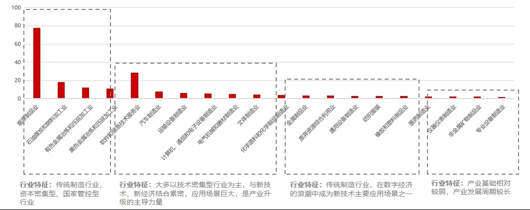 第三类是3<固定资产投资效率<5,主要特征是传统制造行业,在数字经济的浪潮中成为新技术主要应用场景之一。主要行业包括化学原料和化学制品制造业、金属制品业、通用设备制造业、纺织服装业等。
