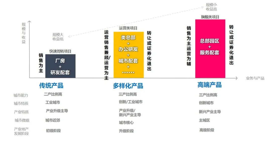 产业地产的产品定位要结合城市进入策略、产业定位策略进行系统性分析,可以根据不同的城市特征、城市性质、产业性质、城市微观和发展阶段,形成三大类产品:第一类是传统产品,包括工业厂房+研发配套等业态,实施快速周转的运营策略;第二类是多样化的产品,主要包括类总部、研发办公、配套服务等业态,实施运营销售兼顾的策略,最终通过整体出售、转让或出租运营REITs实现项目退出;第三类是旗舰类产品,主打核心地段高端产品,主要包括总部经济、研发办公、配套服务等业态,实施销售为主运营为辅的策略,最终通过整体销售等形式实现项目退出。