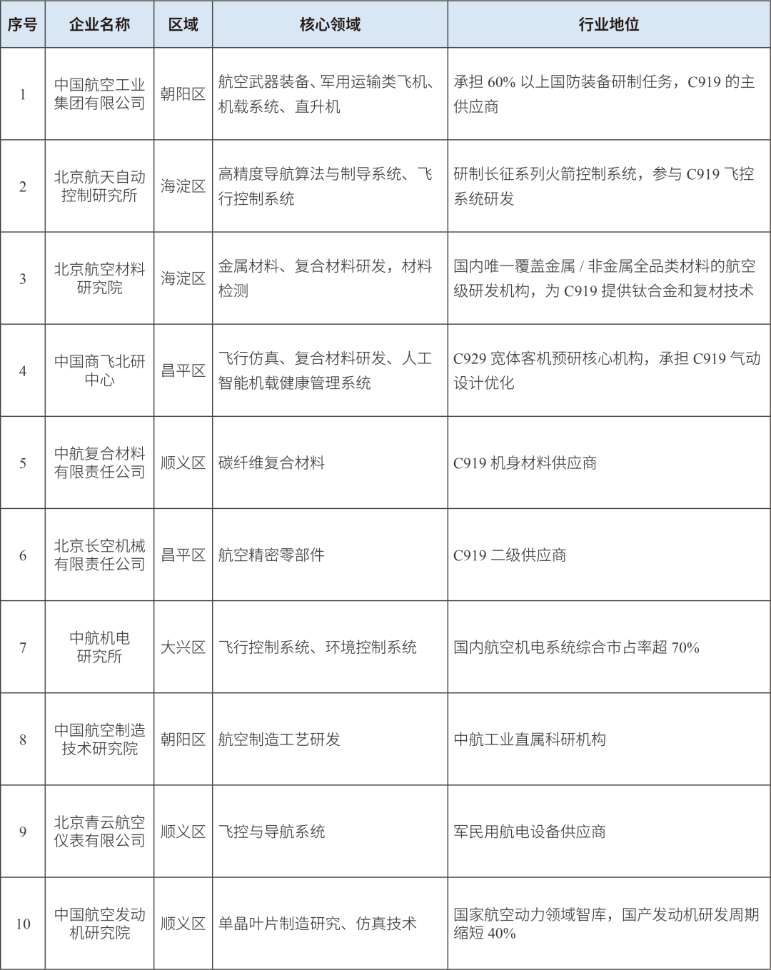 表1 北京市航空制造业重点企业清单(部分)