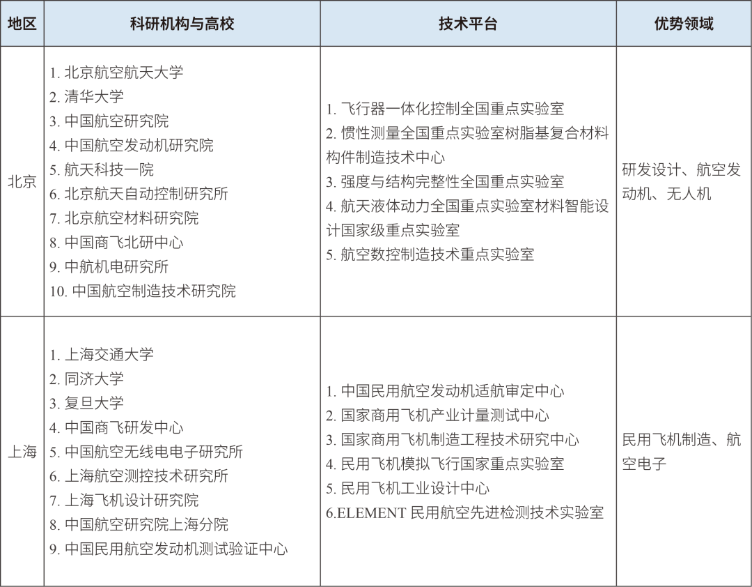 在研发设计和高端制造方面,上海依托经济优势和产业基础,以整机集成等应用研发和商业化生产为主;北京依托科研机构和高校,以关键零部件和无人机的基础研究及高端生产为主,制造产值低于上海。上海作为我国民用航空产业创新策源地,是C919研发设计的核心基地,承担了大部分总体设计和集成研发任务,其中中国商飞上海飞机设计研究院作为国产大飞机研制核心力量,主导C919大型客机、ARJ21新支线飞机等标志性机型的设计研发,形成覆盖全寿命周期的工业设计能力。北京作为我国航空研发设计的核心策源地,聚焦航空电子设备与系统、航空动力、适航取证等关键领域,在飞行器气动设计、智能控制系统、航空发动机等领域实现多项核心技术突破,如中国航发集团牵头承担“两机”(航空发动机和燃气轮机)等国家科技重大专项,通过AES100民用涡轴发动机等标志性产品,实现从“跟跑”到“并跑”的跨越。