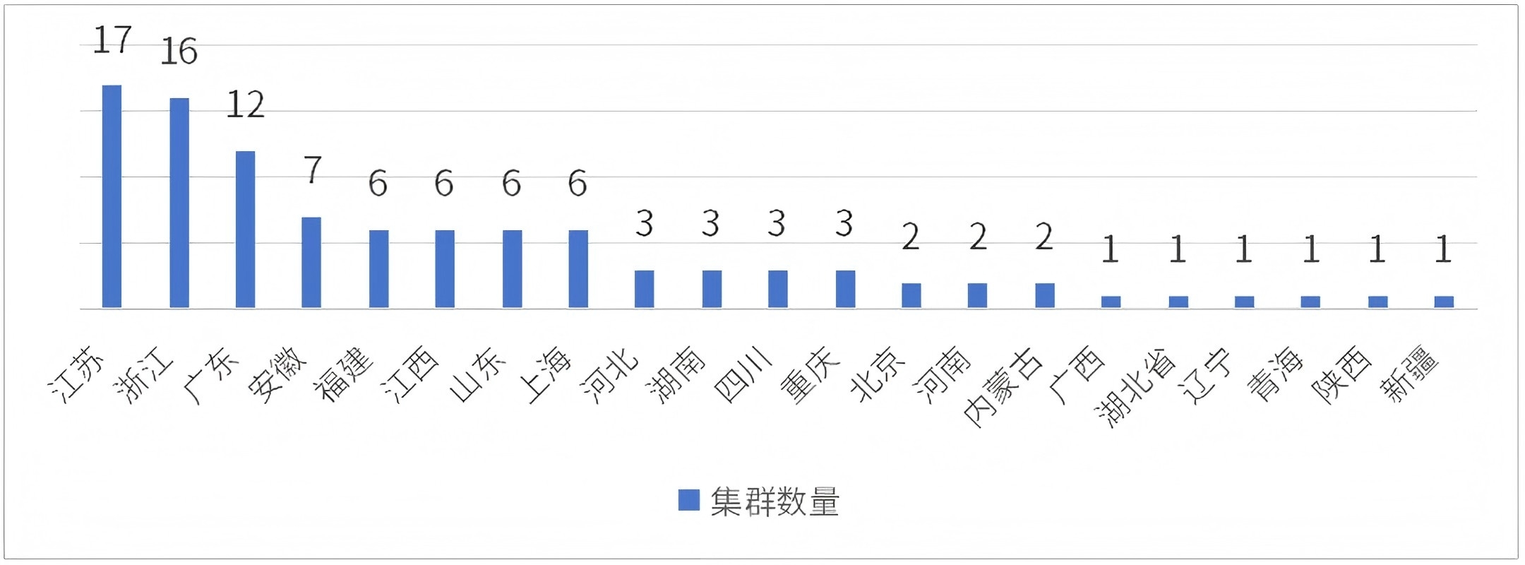 培育发展先进制造业集群是深化区域产业分工、促进制造业迈向价值链中高端、增强产业链供应链韧性的重要手段。截至2024年底,国家级先进制造业集群已达80个,其中,长三角入选26个、覆盖全部7个领域,而京津冀地区入选7个、覆盖4个领域,与长三角相比,无论是数量还是覆盖面均有较大提升空间。此外,2024中国民营经济产业集群百强榜名单中,京津冀只有5个集群,而长三角达到46个,汇集了全国将近一半具有竞争力的产业集群;从单个省份上榜的产业集群数量看,江苏省、浙江省、广东省位列前三名,合计占比45%(见图1)。