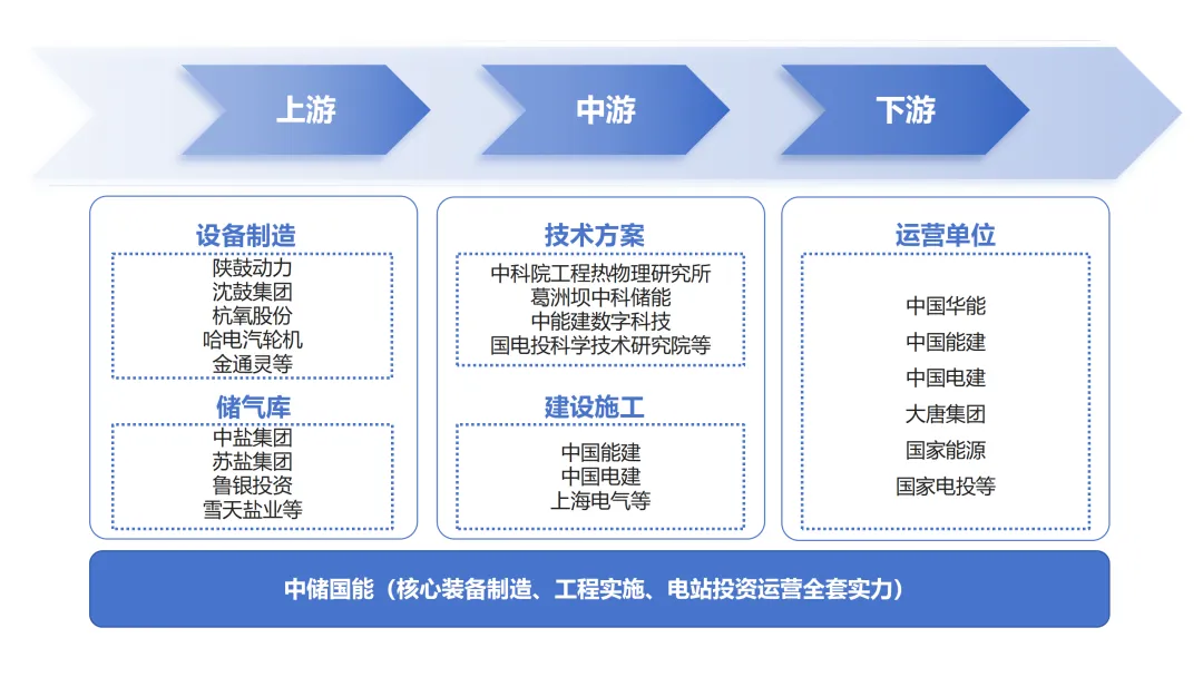 压缩空气储能产业链长、覆盖广,上游产业为设备制造和储气库,中游为技术提供及工程建设方,下游为投资运营商(业主单位),目前在研发和制造等核心环节无卡点,基本实现全环节国产化。