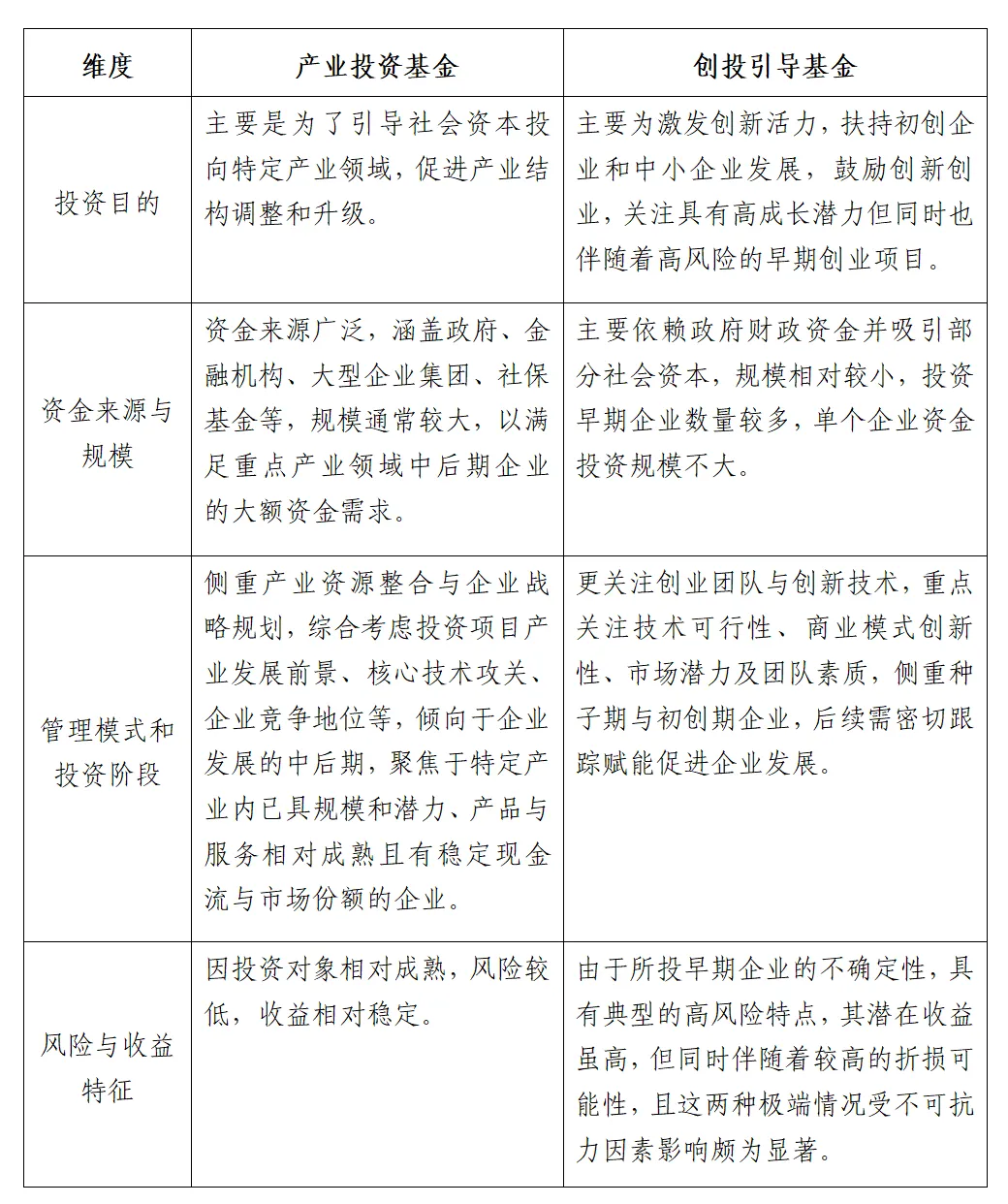 目前政府投资基金主要分为产业投资基金和创投引导基金,二者在多个维度上存在显著差异。