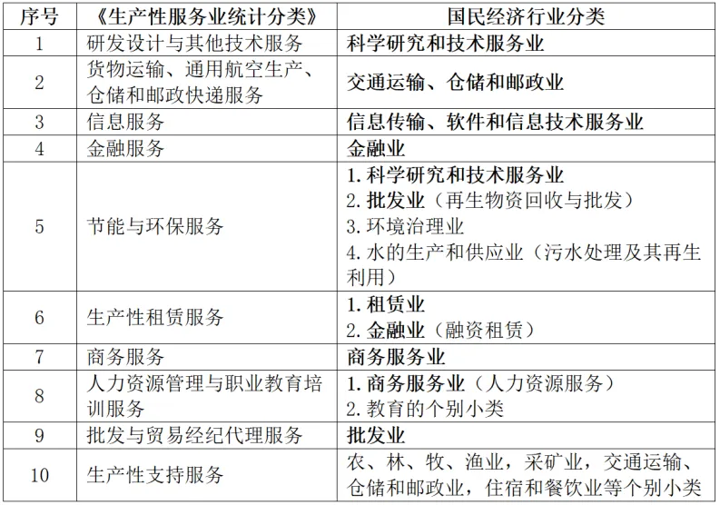 生产性服务业着重发展十大领域。2019年,国家统计局对《生产性服务业分类(2015)》进行修订完善,印发《生产性服务业统计分类(2019)》,明确生产性服务业共有十大类,即研发设计与其他技术服务,货物运输、通用航空生产、仓储和邮政快递服务,信息服务,金融服务,节能与环保服务,生产性租赁服务,商务服务,人力资源管理与职业教育培训服务,批发与贸易经纪代理服务,生产性支持服务。