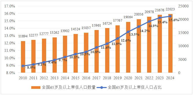 图1 2010—2024年全国65岁及以上老年人口规模及占比情况统计