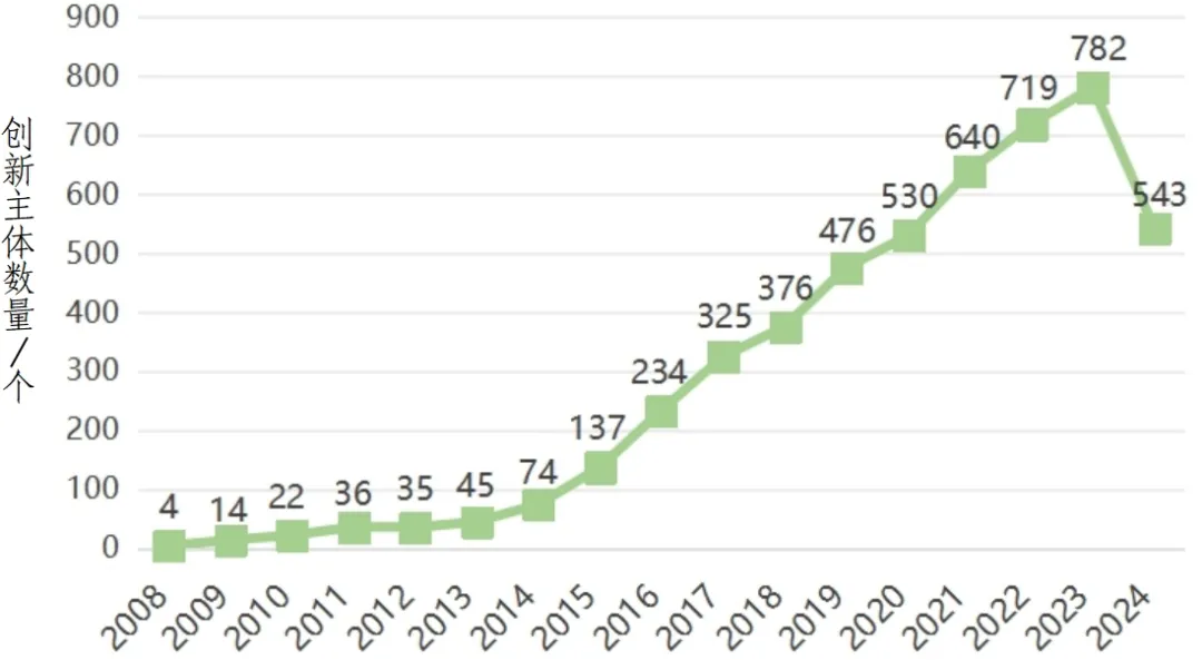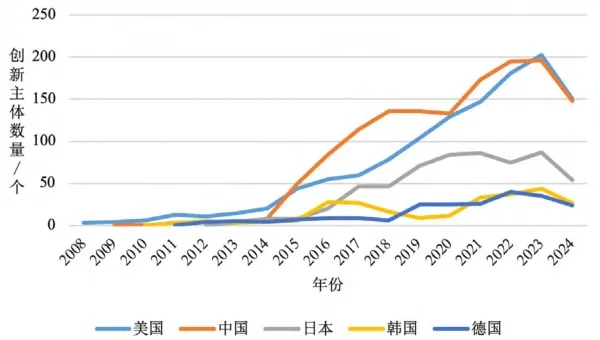创新主体数量看,整体呈“阶梯式跃升-增速回调”特征,中美平分秋色。2008—2013年为技术萌芽期,年均新增主体不足15家;2014年起随资本涌入与技术成熟度提升进入爆发增长期(2014—2017年CAGR达63.8%),2017年突破300家;2018—2023年增速趋缓但仍维持高位(CAGR 15.8%),2023年达到782家的峰值。2024年创新主体数量首次出现负增长,预示行业进入技术路线收敛、市场出清与头部集中化的关键调整期,从“野蛮生长”转向“高质量发展”阶段(图3)。从各国看,自2014年起,我国创新主体数量快速增长,连续多年领跑全球。美国作为eVTOL领域研究的先行者,其创新主体规模保持稳定高增长态势,凭借技术先发优势持续巩固全球主导地位。日本、韩国和德国的创新主体数量虽维持增长态势,但受限于市场规模和产业水平,与中美两国的总量差距持续扩大,eVTOL产业的发展潜力难以与中美两国相比较(图4)。