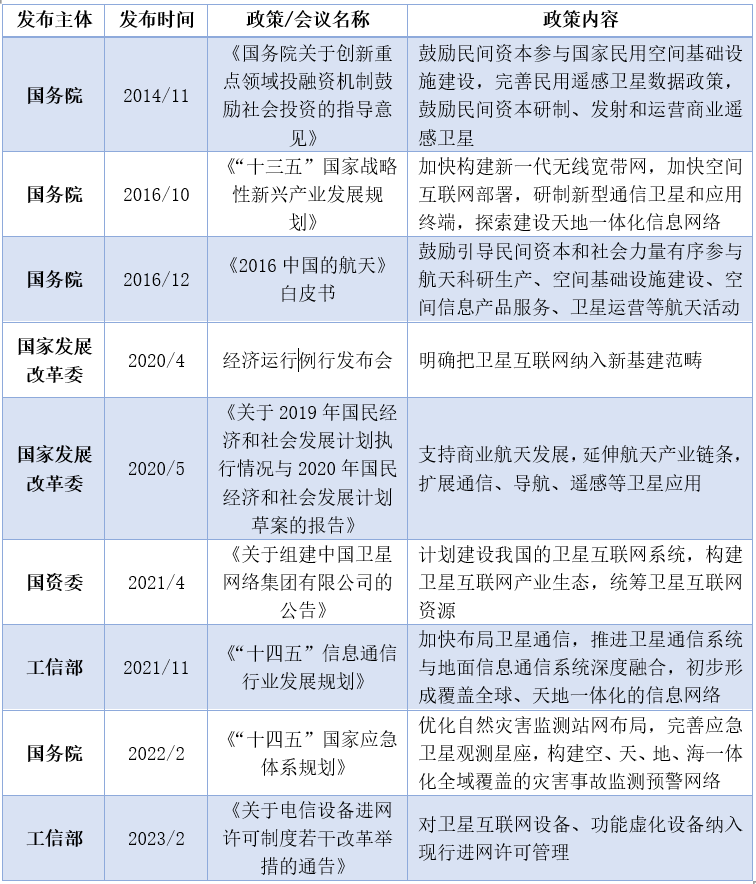 卫星互联网是当前乃至未来相当长一段时期大国竞争的新高地,是我国新型基础设施的重要领域,是构建天地互连网络的重要组成部分。当前,全球主要国家及头部商业企业正积极抢占产业发展先机,构筑竞争壁垒。 一、卫星互联网基本情况 (一)卫星互联网概念及构成 卫星互联网是一种基于卫星通信技术构建的全球性互联网系统,通过卫星组成的网络实现全球范围的覆盖,满足偏远地区、海洋、航空航天等通信需求。 卫星互联网由通信卫星、地面接收站和用户终端构成。通信卫星是卫星互联网的核心,它通过自身天线与地面终端连接,负责接收用户发送的数据,并将数据发送到目标地点;地面接收站是接收卫星信号的设施,将卫星传输的数据转发到互联网或其他目标设备;用户终端包括个人电脑、智能手机、卫星电话等设备。 (二)卫星互联网特点 1.广覆盖:提供覆盖全球的互联网 卫星互联网通过卫星信号实现全球范围的网络覆盖,克服地理限制,实现偏远山区、沙漠、海洋等人口稀少或地理环境恶劣地区的互联网连接,是地面通信网络的补充和延伸。具备灵活性和快速启动等优势,可以作为自然灾害或紧急情况下的有效通信方式。 2.低时延:降低网络的传输延时 卫星互联网低延时的特点使其成为全球范围内实时通信和数据传输的理想选择。通过利用部署在近地轨道的卫星网络,数据信号的往返传输时间被缩短至几十毫秒的水平。在银河航天首发星测试中,典型的延时值在20~40毫秒之间,可以与地面光纤网络媲美。卫星互联网的低延时对金融交易等对于即时数据传输和快速响应需求高的应用场景具有重要意义;同时,低延时的优势在长距离传输中尤为明显,为全球范围内的通信提供可靠的解决方案。 3.宽带化:提供高带宽容量的宽带服务 通过采用高频段通信技术、多点波束和频率复用等先进技术,卫星互联网的通信能力得到显著提升。一方面高频段通信技术提供更广阔的频谱资源,使得卫星互联网能够实现更高的信息传输速率,满足高信息速率业务的需求。另一方面,多点波束技术使得卫星能够同时与多个地面终端进行通信,提高频谱利用效率和资源分配的灵活性。此外,频率复用技术使得卫星可以同时传输多个频段的数据,提高频谱利用率,降低单位宽带成本。 4.低成本:建设成本低于地面通信设施 相比地面基础设施,卫星互联网的基础设施建设成本较低,无需大规模的物理设备和光纤铺设,其建设不会随着地理距离加长而增加成本。同时,卫星互联网具备快速部署和灵活调整的优势,能够根据需求灵活扩展和调整网络,避免过度投资和资源浪费。此外,卫星互联网采用软件定义技术,能够延长卫星的使用寿命,减少人力和物力资源投入,降低更换和维护的成本。 二、卫星互联网的发展过程 (一)初创探索阶段:20世纪80年代~2000年 上世纪80年代,以摩托罗拉公司的“铱星”星座为代表,欧美企业纷纷提出卫星星座计划,积极建设覆盖全球的卫星通信网络。这一阶段目标是通过部署低轨卫星,为全球提供语音通信、低速数据传播和物联网等服务。但同期,地面通信系统发展迅速,卫星通信的优势减弱。 (二)商业化发展阶段:2000年~2014年 2000年以后,以新铱星、全球星和轨道通信公司等为代表,将卫星互联网定位为对地面通信系统的补充和延伸,卫星互联网进入商业化发展的阶段。新铱星、全球星通过重新部署卫星星座,实现偏远地区、海洋以及灾难区网络覆盖;轨道通信公司致力于物联网应用,主要应用于跟踪和监测物流、农业和环境等领域的数据,提高效率和可持续性。 (三)快速崛起阶段:2014年~2020年 2014年以后,以OneWeb、SpaceX、亚马逊等企业为代表筹划建设新型卫星互联网星座,该阶段星座规模数量庞大,企图实现全球范围的互联网覆盖,并与地面通信系统进行融合发展,卫星互联网逐步步入宽带互联时代。同时,我国航天科工、航天科技等企业也提出建设卫星互联网星座计划,旨在利用卫星网络为全球提供高速互联网。 (四)快速创新发展阶段:2020年至今 2020年以后,以SpaceX公司一箭多星、可回收、低成本等技术为代表,新的技术和解决方案不断涌现,卫星互联网进入快速创新发展阶段。同期,中国将卫星互联网纳入新型基础设施,并成立中国星网公司,推动卫星互联网的建设。该阶段,卫星互联网建设目标更加明确,技术快速迭代更新,国际竞争和头部企业间竞争进入快车道。 图1 卫星互联网发展阶段 三、我国卫星互联网发展现状 (一)政策力度加大,引导产业高质量发展 国家高度重视卫星互联网发展。国家出台一系列政策文件,为卫星互联网产业发展提供政策支持和指导。2014年,国务院发布《关于创新重点领域投融资机制鼓励社会投资的指导意见》,首次鼓励民间资本积极参与卫星研制、发射和运营商业遥感卫星,标志着我国开始从政策层面鼓励民营企业参与商业航天发展。2020年4月,国家发改委明确将卫星互联网纳入“新基建范畴”,作为新一代通信网络设施的重要组成部分,与5G、物联网、工业互联网等并列。2021年11月,工信部发布《“十四五”信息通信行业发展规划》,提出加快布局卫星通信,推进卫星通信与地面信息通信系统深度融合。2023年2月,工信部放开卫星互联网设备进网许可管理,为卫星通信网络的部署建设提供便利。 表1 我国卫星互联网产业发展相关政策
