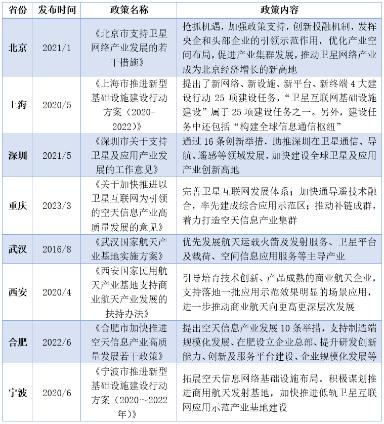 各地方省市积极抢抓产业发展先机。在国家大力推动卫星互联网的发展之下,部分重点城市如北京、上海、深圳、重庆、武汉、西安、合肥、宁波等,纷纷制定卫星互联网产业支持政策,积极争取成为国内卫星互联网产业的领军者。 表2 我国部分省份卫星互联网相关政策