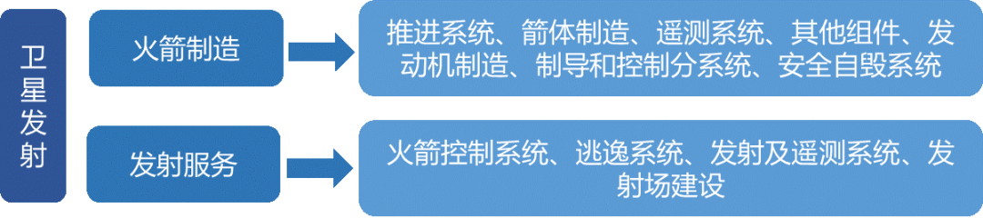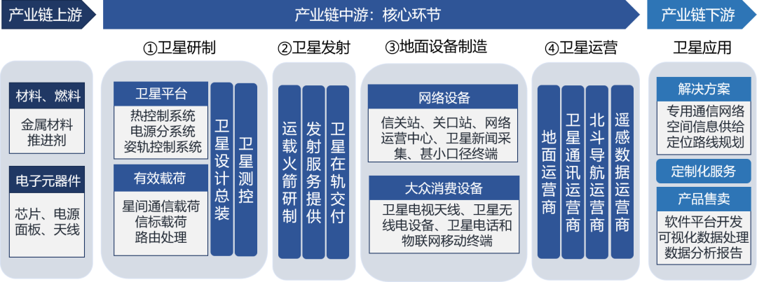 (三)国企民企齐发力,合力推动产业快速发展 我国卫星互联网产业起步晚,面对稀缺且不可再生的轨道资源,正在加快产业布局。一方面,国家积极整合优势资源,2021年在雄安注册成立中国卫星网络集团有限公司(星网集团),致力于建设一个更加庞大的低轨卫星移动通信与空间互联网系统。另一方面,形成以航天科技、航天科工、中国卫星等国家队引领,银河航天、九天微星、航天宏图、和德宇航等民营企业积极参与的多元化卫星互联网产业格局,推动技术创新、商业化发展和行业繁荣。 四、卫星互联网产业链情况 卫星互联网核心产业的产业链主要包含卫星研制、卫星发射、地面设备、卫星运营及服务四大环节。向上延伸主要为材料、燃料、电子元器件,向下延伸主要为应用环节。 图2 卫星互联网产业链 (一)卫星研制环节及代表企业 卫星研制环节包括卫星平台、卫星载荷,具体细分领域如下。 图3 卫星研制产业全景图 在卫星研制环节,航天科技、航天科工作为国家队,承担着多个卫星项目,包括高分系列遥感卫星、北斗导航卫星和气象卫星等研发和制造。民营队包括银河航天、九天微星等企业。其中,银河航天是国内商业卫星互联网的第一家独角兽企业,目前已经发射8颗试验卫星,组建星地融合5G试验网络“小蜘蛛网”。九天微星专注于小型卫星的研制和应用,率先实现民营企业百公斤级卫星的自主研制及在轨验证。 (二)卫星发射环节及代表企业 卫星发射环节包括火箭制造和发射服务,具体细分领域如下。