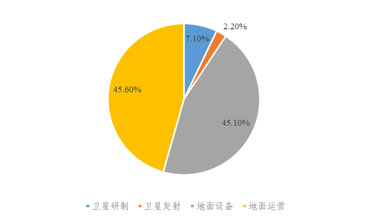 图6 卫星运营及服务产业全景图 卫星运营及服务环节是卫星互联网产业链中的重要组成部分。国家队中,中国卫通主要运营高轨通信卫星,开展电视广播、海事通信、应急通信等业务;中国星网未来主要负责低轨卫星互联网星座的运营。目前,受限于通信卫星运营牌照申请的壁垒,民营队暂未有企业获得该项运营许可。 五、卫星互联网产业规模情况 (一)整体产值规模 美国卫星产业协会(SIA)数据显示,2021年全球卫星通信行业规模达到1816亿美元,近5年复合增长率11.98%。中商产业研究院研究数据显示,2021年中国卫星互联网行业市场规模达到292.48亿元,预计2025年将增长至446.92亿元,2021~2025年复合增长率达到11.18%,卫星互联网行业前景广阔。随着卫星通信技术的不断创新和商业化应用的推进,卫星互联网行业将为全球用户提供更广泛、可靠的通信和互联网服务,同时为相关企业和市场带来巨大的商机和经济价值。 图7 我国卫星互联网市场规模预测(单位:亿元) (二)各细分领域产值规模 数据显示,卫星互联网产业链中卫星研制、火箭发射、地面设备和运营服务占总市场规模的比例分别为7.10%、2.20%、45.10%和45.60%,卫星研制和发射是产业链中的关键环节,但仅占据相对较小的市场份额,而地面设备和地面运营则占据相对较大的市场份额,起着关键支撑和运营角色。当前整个产业处于组网阶段,因此卫星研制和发射占据主导,随着组网完成,运营及下游应用将占据主导。