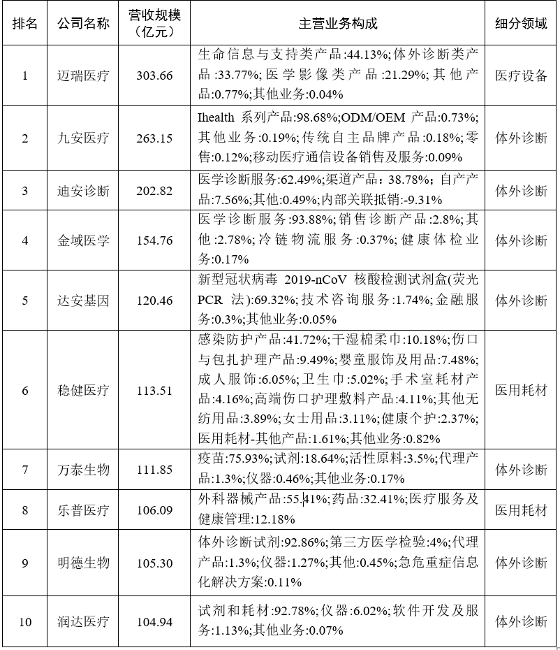 图2 中国A股医疗器械产业各年上市企业数量 从上市时间看,近三年高峰涌现。自2011年起,医疗器械企业上市活跃度逐渐上升,2020-2022年国内医疗器械行业迎来上市热潮,三年间上市企业合计数量占总数的比重达到近一半,其中体外诊断企业上市表现尤为突出,三年合计上市23家;2022年医疗设备类企业成为上市主力,有11家相关企业上市。 从所属地域看,南方地区活跃度较高。广东省上市企业29家,江苏省上市企业19家,上海市上市企业18家,浙江省上市企业11家,以上四地上市企业占全国总数的55.8%。北方地区以北京市、山东省两地较为突出,北京市上市企业18家,山东省上市企业10家,两地上市企业占全国20.3%。 二、经营分析 (一)医疗器械行业实现稳健增长,2022年营业收入同比增长约24.5% 2022年,医疗器械上市公司业绩稳健增长,138家医疗器械上市公司实现营业收入达4139亿元,其中体外诊断领域约2181亿元、医疗设备领域约1011亿元、医用耗材领域约944亿元,相比2021年医疗器械上市公司实现的营业收入总额3324亿元,增长约24.5%。在过去三年,医疗器械行业受抗疫带来的需求推动、实施分级诊疗政策导致的采购需求增加、国产化替代进程加速等多方面积极影响,呈现了蓬勃发展的态势。 具体来看,其中有94家企业实现了营业收入同比增长,占比68.1%,其中有7家企业实现营业收入翻倍:九安医疗(997.8%)、安旭生物(287.97%)、明德生物(272.12%)、亚辉龙(237.95%)、兰卫医学(136.13%)、怡和嘉业(113.64%)、凯普生物(109.39%)。除了怡和嘉业为医疗设备类企业外,其余均为体外诊断类企业。 有44家企业营业收入同比下滑,其中有11家来自体外诊断领域,17家来自医用耗材领域,15家来自医疗设备领域。其下滑的主要原因: 体外诊断领域:由于新冠检测试剂产品在国内外市场竞争日益激烈,导致新冠抗原检测试剂产品的销售需求和单价显著下降,对公司业绩产生巨大负面影响。 医用耗材领域:受新冠事件影响,全球对一次性防护产品的需求激增。然而,2022年供需关系和市场环境发生巨大变化导致产能过剩。中小厂商之间的价格竞争促使终端价格回落至常态化水平甚至更低,因而医用耗材企业的营业收入同比下滑。 医疗设备领域:受国际局势影响,医疗设备行业长期处于能源短缺、全球物流效率大幅下降和供应紧缺的态势中,导致全球芯片及电子元器件等关键物料的价格大幅上涨。此外,消费端需求释放减缓并出现结构化升级等因素也对医疗设备企业的业绩产生了影响。 表1 2022年我国医疗器械上市企业营收规模TOP10