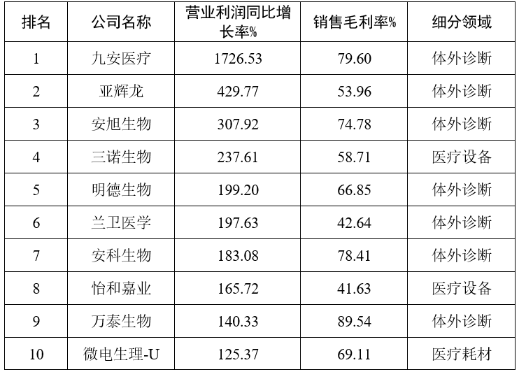 (二)医疗器械行业利润分化,体外诊断表现突出,医用耗材下滑明显,医疗设备保持稳定增长 与此同时,行业毛利率继续维持高位,利润领域分化也愈发明显。2022年行业销售毛利率达53.9%,其中体外诊断领域营业利润同比增长明显,行业前10名中有8家属于体外诊断领域。 表2 2022年我国医疗器械上市企业利润增长率TOP10