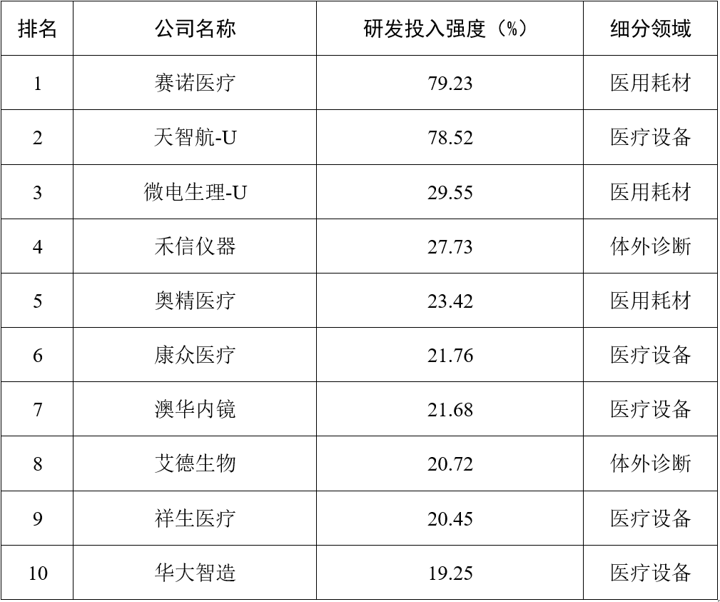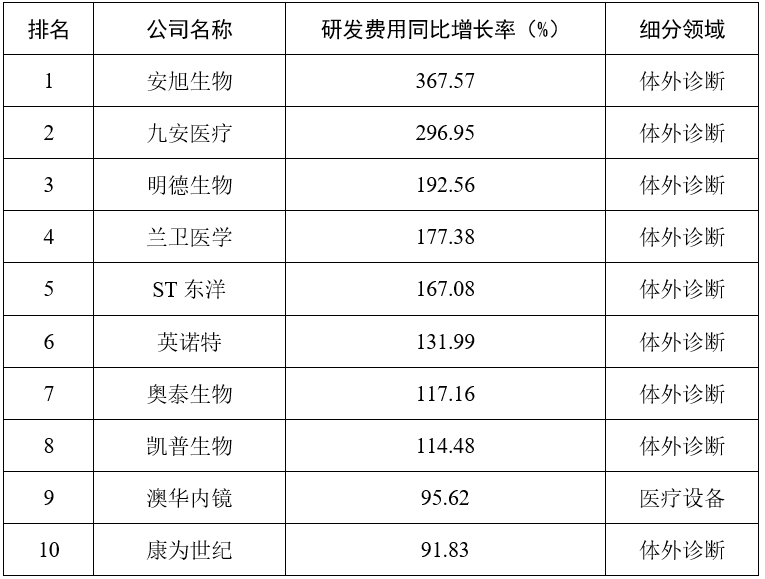 体外诊断行业是医疗器械行业中收入规模、归母净利润规模最大且增速最高的子行业。51家体外诊断上市公司2022年实现营收总额2181.5亿元,营业收入同比增长率59.5%,归母净利润同比增速超50%。体外诊断的业绩高增长,与国内体外诊断企业抓住呼吸道传染病在全球持续蔓延的机遇,重点推动新冠抗原检测、新冠抗体检测等系列产品在海外市场化推广,使国外销售收入激增等密切相关。九安医疗2022年报显示其涵盖新冠抗原检测试剂等产品在内的iHealth系列产品在国内国际市场实现销售放量,iHealth系列产品销售收入259.7亿元,同比增长1296.3%,占该公司营业收入的比重为98.7%。 医用耗材行业是医疗器械行业中营收规模最小,净利润下滑最明显的子行业。46家医用耗材类上市公司2022年实现营收总额944亿元,营业收入同比增长率3.3%,归母净利润同比下滑超过50%。可能与医用耗材行业供应过剩、量价齐跌以及高端耗材集采普及的影响有较大的相关性。英科医疗、中红医疗、振德医疗在2020年归母净利润同比增长10倍以上,此后受库存高企、竞争加剧的态势下供过于求及价格大幅回落等因素影响,过去两年,英科医疗、中红医疗、振德医疗的经营业绩均出现不同程度的下滑回落。2022年,英科医疗、中红医疗的归母净利润同比下滑幅度均超过90%,振德医疗2021年归母净利润同比下滑76.6%。高端耗值集采常态化也对医用耗材企业业绩造成显著影响,大博医疗、凯利泰、威高股份等高值耗材企业业绩均在2022年出现明显下滑。 医疗设备行业是医疗器械行业中营收规模最稳定,受疫情冲击最小的子行业。40家医疗设备类上市公司2022年实现营收总额1010.7亿元,营业收入同比增长7.82%。近三年,医疗设备子行业虽同样受疫情变化的影响,带来生命监护类设备需求回落的冲击,但因分级诊疗政策下基层医疗机构设备配置需求逐步释放,整体还是实现了较为稳健的业绩增长。2022年,怡和嘉业家用呼吸机的需求量较去年同期均显著提升,奕瑞科技的齿科、普放、放疗类产品均保持稳定增长,山外山的血液净化设备受国产替代系列政策利好形势,销售业绩增长较好。 三、研发投入 体外诊断类企业研发费用增速最大。2022年体外诊断类上市公司平均研发费用同比增长53.8%,增速最高的为安旭生物,达到367.6%。平均研发费用占营业收入比例8.73%,其中研发投入强度最高的禾信仪器为27.72%。 医用耗材类和医疗设备类企业仍是研发投入主力。2022年医用耗材类上市公司平均研发费用同比增长16.06%,增长比率最高的为奥精医疗,达到72.91%。平均研发费用占营业收入比例9.99%,研发投入强度最高的赛诺医疗为79.22%。2022年医疗设备类上市公司平均研发费用同比增长20.66%,增长比率最高的为澳华内镜,达到95.62%。平均研发费用占营业收入比例12.32%,研发投入强度最高的天智航为78.52%。 表3 2022年研发费用同比增长率TOP10