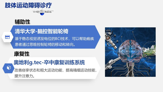 当前的研究和应用多为非侵入式,主要分为辅助性和康复性两类,是业界进展相对较快的领域。辅助性BCI着重于替代或增强物理功能,通过捕捉患者的运动意图,进而控制外部设备如假肢或外骨骼等。康复性BCI则专注于通过神经康复训练恢复或改善患者的运动能力,利用中枢神经系统的可塑性,通过重复性刺激来强化神经元之间的突触连接,促进修复。