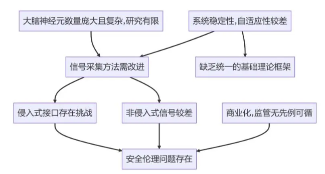安全和伦理面临挑战。统一的BCI基础理论框架和科学评价体系尚处缺位,面临知情同意、安全性、隐私、主体性和公平性等伦理问题。侵入式设备的高性能与创伤、出血、感染等脑损伤的高风险难平衡。思想被扫描、读出和监控的边界尚难界定,存在隐私泄露、黑客攻击等风险。