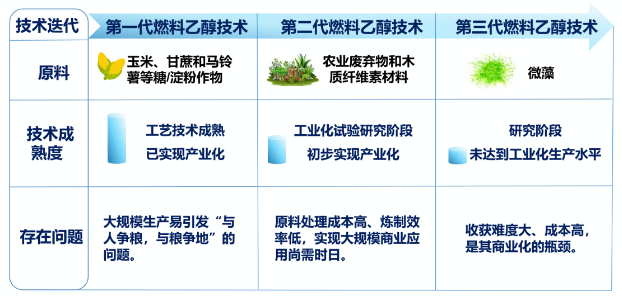 生物燃料指通过生物质生产的生物乙醇、生物柴油、生物航煤等,是生物能源产业化进程最快的细分领域之一。在基因工程、代谢工程、合成生物学等多学科技术发展推动下,利用“细胞工厂”高效合成生物燃料的绿色生产模式日益成熟。其生产原料由第一代粮食作物加快向第二代非粮原料转变,微藻等第三代原料技术也逐渐兴起。以生物乙醇为例: