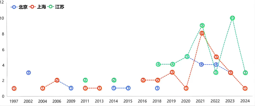 图4 北京、上海、江苏获批上市创新药的年份分布情况
