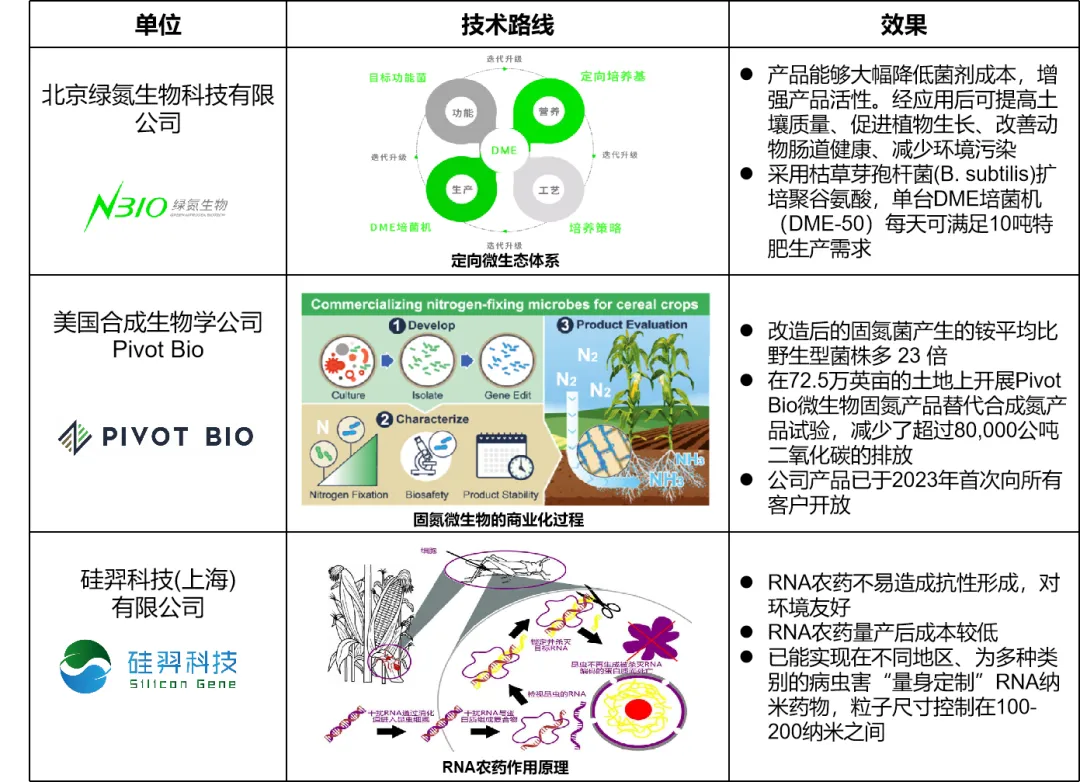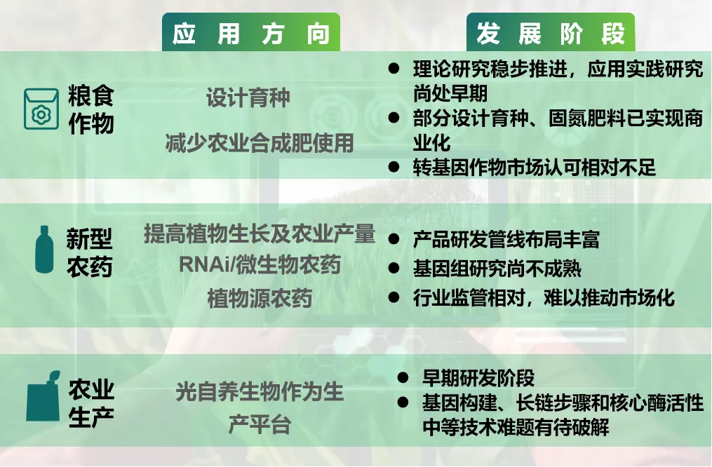 合成生物学技术与农业领域的结合日益紧密,并在部分方向上已有商业化成果。目前,农业合成生物学的基础研究主要集中在人工细胞合成、细胞工厂、种质改良、二氧化碳固定、生物固氮和农业环境优化等方面,应用研究主要集中在植物天然产物开发、农作物性状改良、病虫害防控、肥料生产、饲料及添加剂制备等方面,目前能够或接近实现商业化的应用主要集中在作物育种、固氮肥料、农药生物制造等领域。相比之下,生物固碳、生物固氮和代谢途径改造等仍处于初期概念阶段。