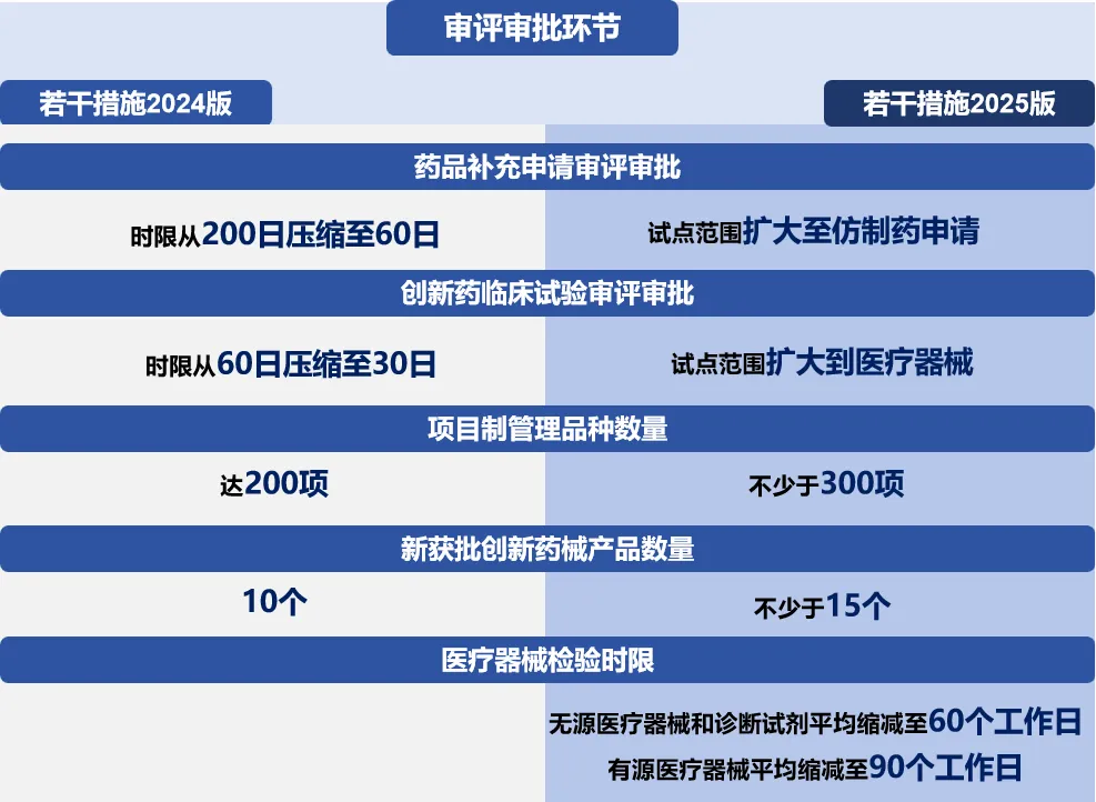临床试验审评审批方面,持续深化国家药监局相关试点工作,将优化创新药临床试验审评审批试点扩大到医疗器械,将药品补充申请审评审批试点争取扩大至仿制药申请。药械检验检测能力方面,首次明确提出提效量化目标,推动实现无源医疗器械和诊断试剂平均缩减至60个工作日、有源医疗器械平均缩减至90个工作日,持续保持医疗器械检验能力全国领先地位。针对临床急需药械产品,在全国率先实现即收即检。项目制管理方面,持续扩大服务范围和对象,较2024年新增纳入项目制服务药械品种数量100项,累计达300项。多项举措助力药械产品上市“加速度”,实现2025年新获批创新药械产品数量不少于15个。