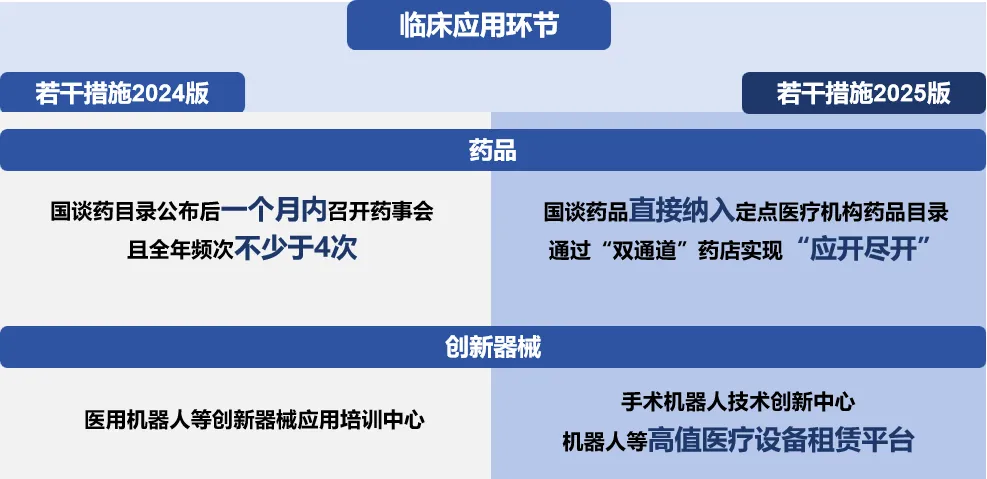 创新药方面,相较于上海、广东等地增加召开药事会频次,北京率先提出国谈药可直接纳入全市定点医疗机构药品目录,无需召开药事会,医疗机构可通过“双通道”药店实现“应开尽开”。此外,支持医疗机构针对创新价值高但临床数据较少、实际证据不充分的药物开展真实世界研究,验证药物临床价值。创新医疗器械方面,搭建机器人等高值医疗设备租赁平台,运用市场化方式打通创新医疗器械入院“最后一公里”,破解创新医疗器械高成本与推广难的矛盾,加快手术机器人入院应用和创新迭代。