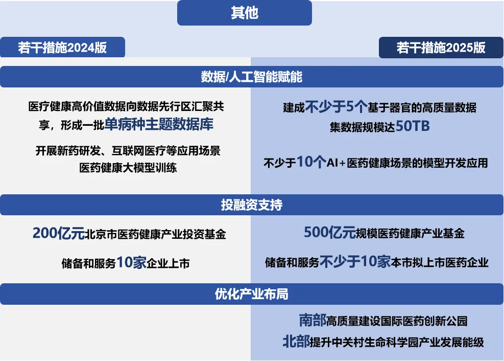 《若干措施2025版》提出要优化创新医药产业布局。南部高质量建设国际医药创新公园,对标国际一流产业社区,建设全国医药创新人才在华创业第一站,共同打造首都南部医药产业升级新引擎。北部提升中关村生命科学园产业发展能级,加快建设专业园区、综保区、研发验证平台以及服务科学家创业全过程的专业孵化器,共同打造原始创新与未来产业策源地。通过区域协同发展形成互补,实现从研发到转化的全链条创新生态构建,整体提升北京医药产业竞争力。