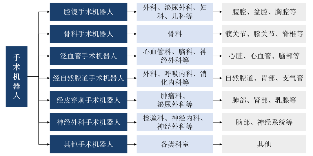根据临床场景,主要分为腔镜、骨科、泛血管、经自然腔道、经皮穿刺、神经外科手术机器人等。