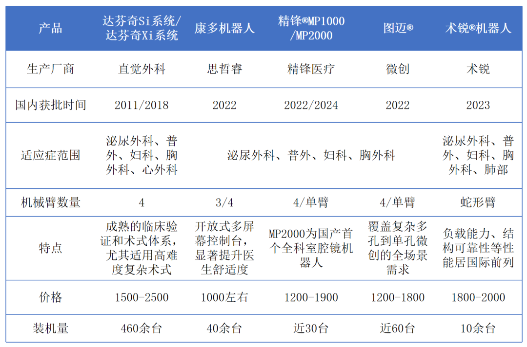 截至目前,国内累计获批超10款,包括达芬奇Si和达芬奇Xi、思哲睿康多、精锋MP1000、微创图迈、术锐®机器人等,装机量近600台。达芬奇凭借成熟的临床验证和完整的术式体系,占据70%市场,国产产品凭借性价比和本土化优势等正加速入局,其中,微创的图迈是国内最早上市的四臂腔镜机器人,产品性能国内外领先,远程系统优势突出,在全球超30个国家或地区获得注册认证,成功进入欧洲市场;精锋医疗MP2000兼具科室广度、术式难度优势;康多机器人以更高性价比优势加快进入县级医院市场。